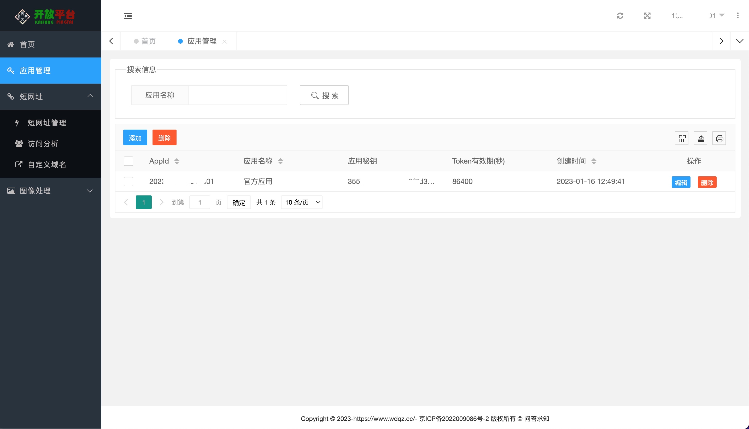 需要注意的一点:当应用下有有效短网址的时候,不允许进行删除操作。